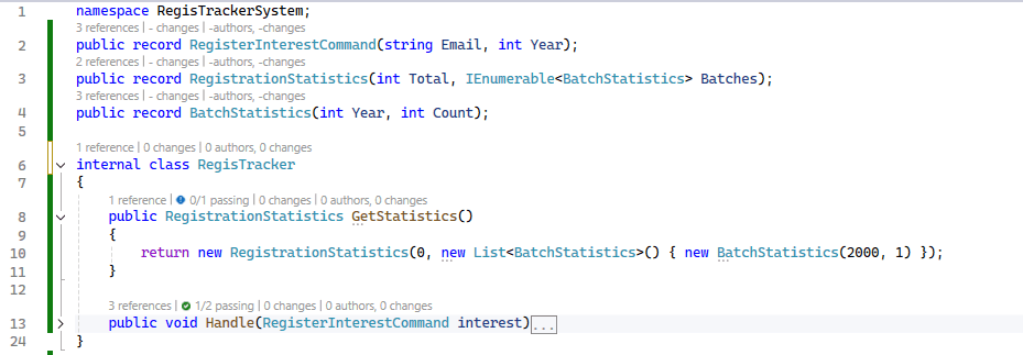 This was the first test I wrote, and it resulted in a hardcoded class to satisfy the current requirements. I also renamed a few things because names are important. Red, Green, Refactor, I’ve now moved this to its own class library and added a reference to it from the tests.