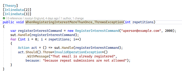 Next post will be writing more tests that will focus on using events driving the behavior change in our Domain model. Maybe we’ll finally get to see some event sourcing in action.