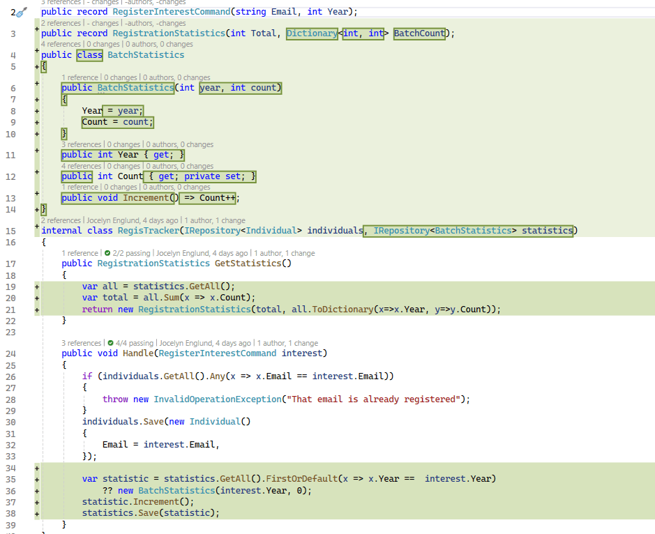 From the last post, I decided to to rename my Aggregate to Individual to align more with a ubiquitous language, a key component of DDD. 😉 I also updated the read model to contain a list of multiple batch statistics so the api would return a single object and not an array of objects.