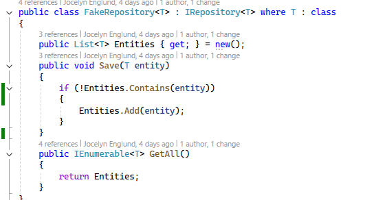 I did have to make an update to the fake repository since it is in memory, i didn’t have to worry about saving changes to existing items, but i did need to not add the same entity if it is already in the list.
