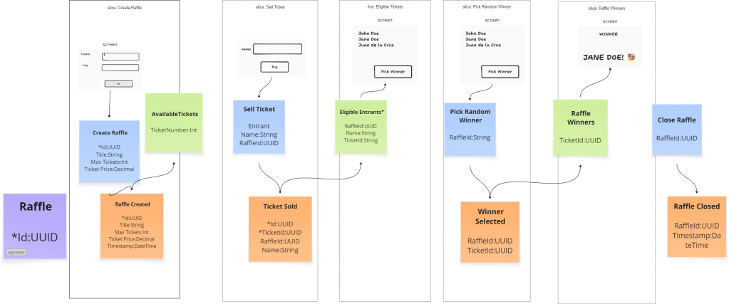 A few weeks ago, I wanted to try out the process of event modeling for designing and then building a simple application. I had picked a simplified raffle application and ended up drawing out the following features: