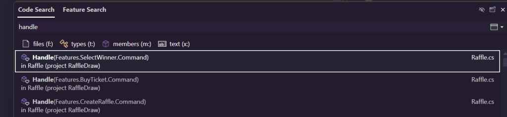 The same goes for doing a code search on Handle in visual Studio, it does a great job of making sure the context of the class is visible.