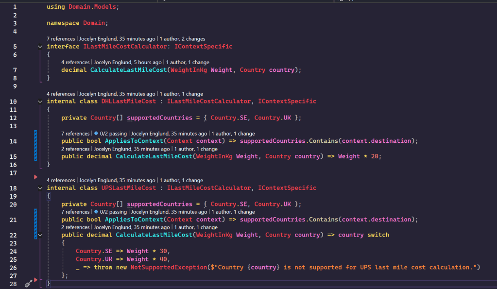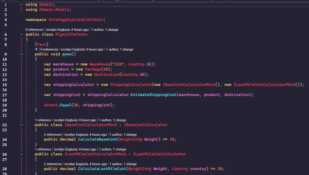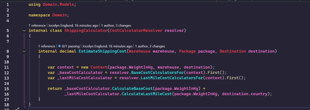 At this point, I know that the warehouse, the product and destination should play a role and that we will need to be calculating both the base costs and last mile costs. We don’t have to get into specifics to start with since our only focus now should be building up the shipping calculator, so I just create the the input classes and then interfaces for the calculation components.