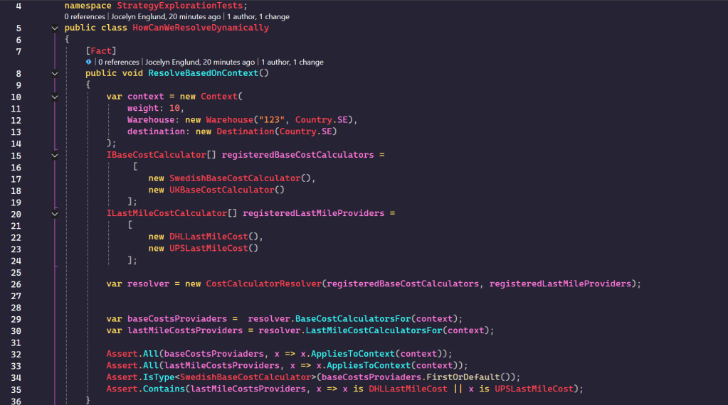 From the resolver, I expect to be able to call BaseCostCalculatorsFor and LastMileCalculatorsFor and pass in the context I created. I added the assertions one by one while building the implementation that would make it pass.