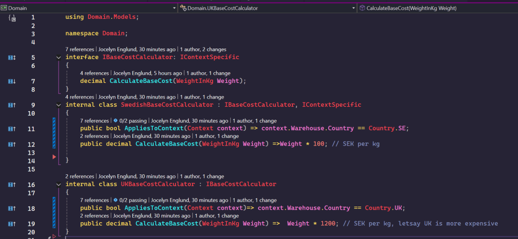 The resolver’s code is simple, I just had to add a method on the calculator that takes in the context so the calculators themselves can decide whether they apply to a context or not.