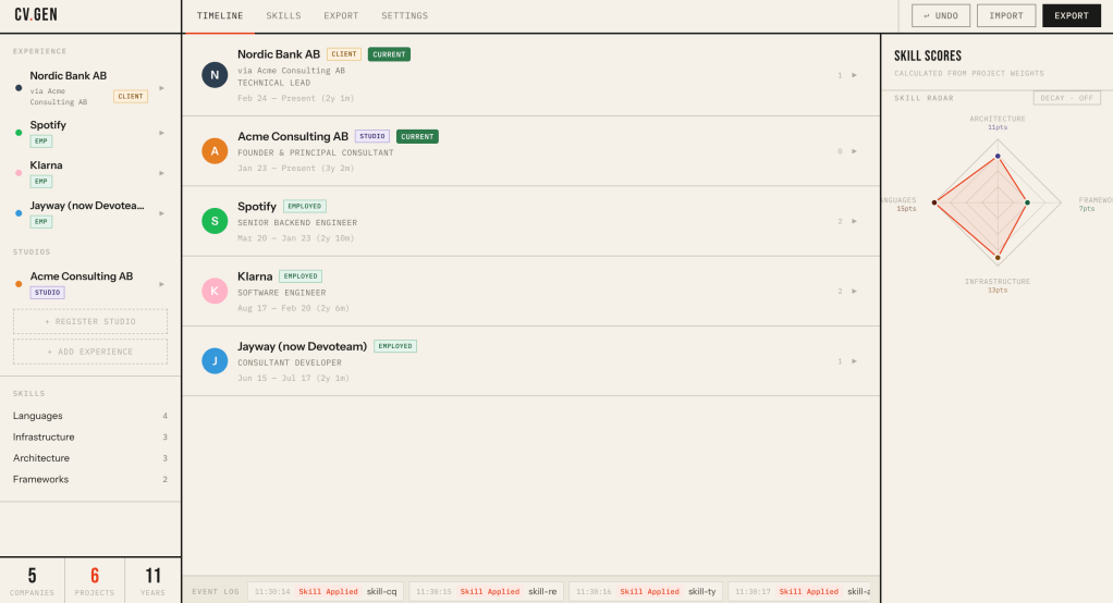 CV.Gen is an app for putting together your CV with skills as tags. You get a clean export of your data in a resume format, but you can also export your data as JSON that you can use to render a different template. It’s all about keeping your data local first.